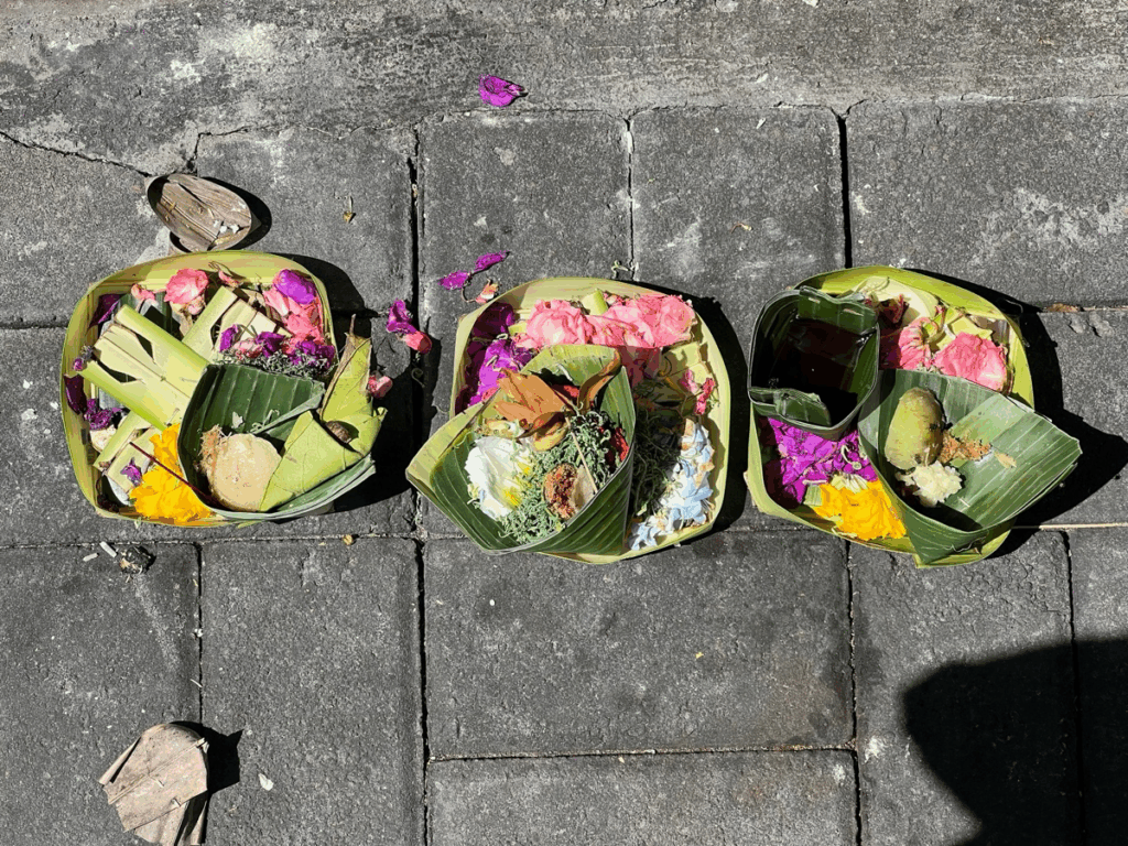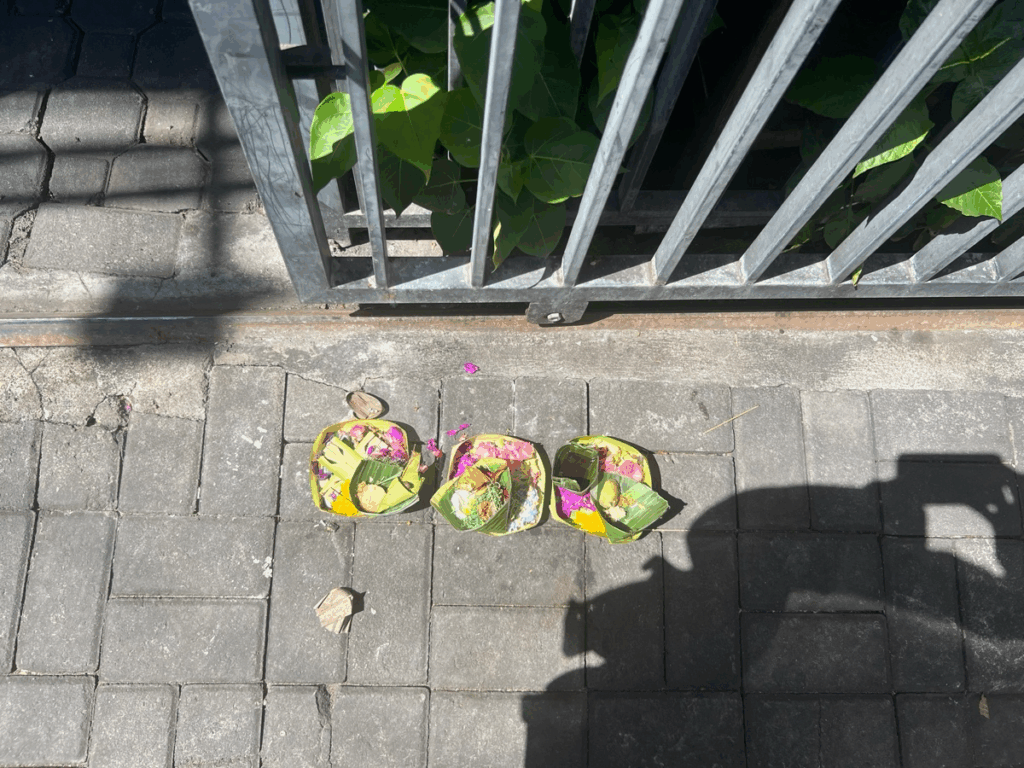 발리의 길거리를 다니다 보면 음식과 꽃 등이 담긴 야자 나뭇잎 접시를 쉽게 볼 수 있다. “짜낭 사리(canang sari)” 라고 불리는 이것은 힌두교 신자들이 매일 신에게 감사와 평화를 기원하는 마음을 담아 바치는 제물이다.